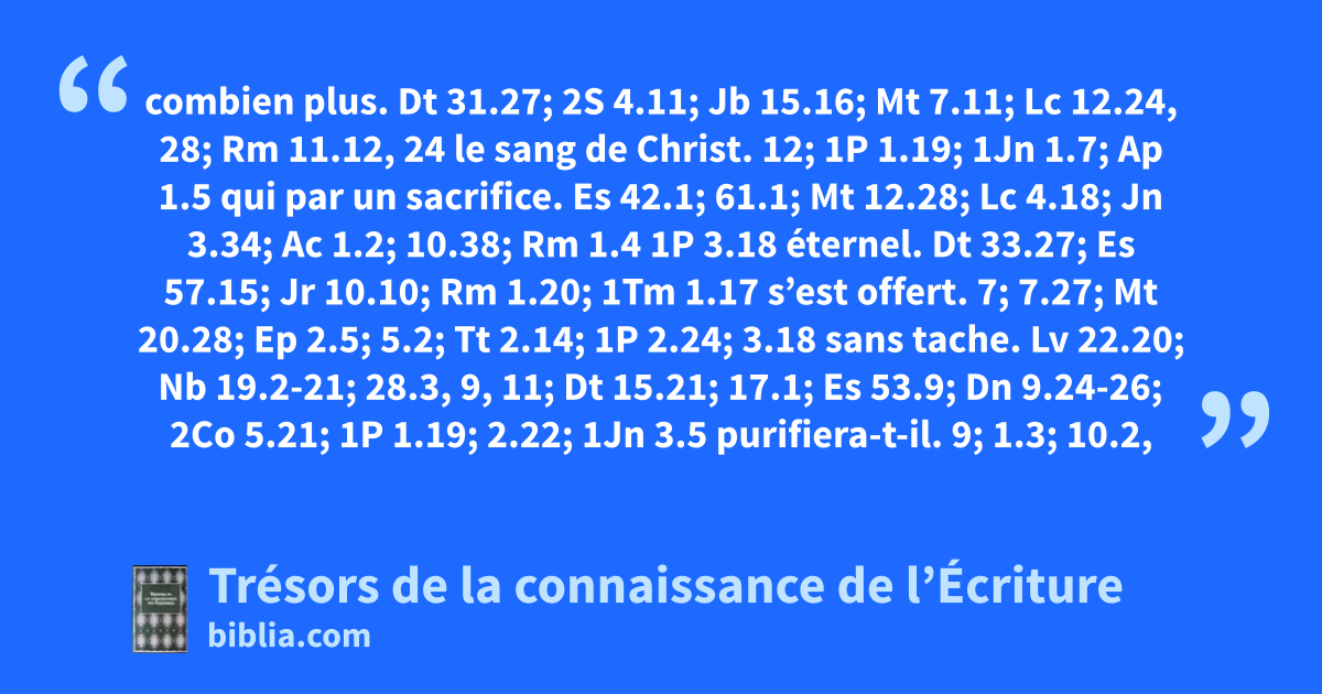 combien plus. Dt 31.27; 2S 4.11; Jb 15.16; Mt 7.11; Lc 12.24, 28; Rm 11.12, 24 le sang de Christ. 12; 1P 1.19; 1Jn 1.7; Ap 1.5 qui par un sacrifice. Es 42.1; 61.1; Mt 12.28; Lc 4.18; Jn 3.34; Ac 1.2; 10.38; Rm 1.4 1P 3.18 éternel. Dt 33.27; Es 57.15; Jr 10.10; Rm 1.20; 1Tm 1.17 s’est offert. 7; 7.27; Mt 20.28; Ep 2.5; 5.2; Tt 2.14; 1P 2.24; 3.18 sans tache. Lv 22.20; Nb 19.2-21; 28.3, 9, 11; Dt 15.21; 17.1; Es 53.9; Dn 9.24-26; 2Co 5.21; 1P 1.19; 2.22; 1Jn 3.5 purifiera-t-il. 9; 1.3; 10.2, 22 des œuvres mortes. 6.1 afin que vous serviez. Lc 1.74; Rm 6.13, 22; Ga 2.19; 1Th 1.9; 1P 4.2 le Dieu vivant. 11.21; Dt 5.26; 1S 17.26; 2R 19.16; Jr 10.10; Dn 6.26; Ac 14.15 2Co 6.16; 1Tm 3.15