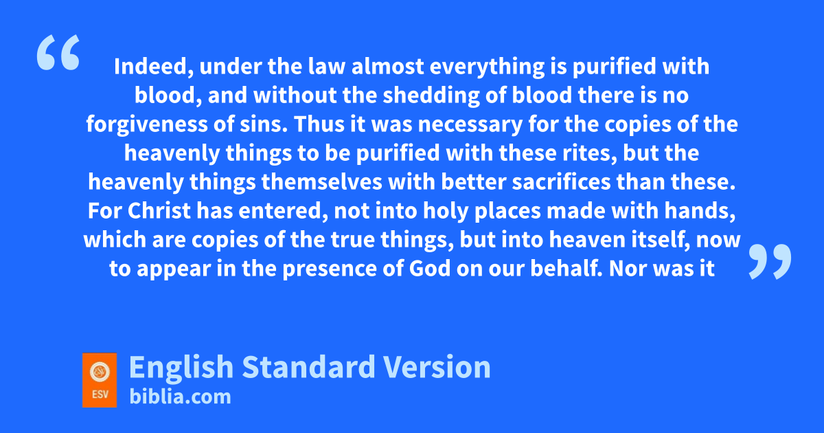 23 Thus it was necessary for gthe copies of the heavenly things to be purified with these rites, but the heavenly things themselves with better sacrifices than these. 24 For Christ has entered, not into holy places hmade with hands, which are copies of the true things, but into heaven itself, now to appear in the presence of God ion our behalf. 25 Nor was it to offer himself repeatedly, as jthe high priest enters kthe holy places every year with blood not his own, 26 for then he would have had to suffer repeatedly since the foundation of the world. But as it is, lhe has appeared monce for all nat the end of the ages to put away sin by the sacrifice of himself. 27 And just as oit is appointed for man to die once, and pafter that comes judgment, 28 so Christ, having been offered once qto bear the sins of rmany, will appear sa second time, tnot to deal with sin but to save those who are eagerly uwaiting for him.