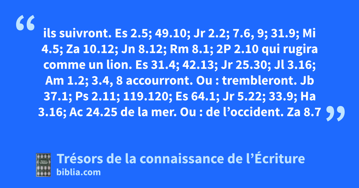 ils suivront. Es 2.5; 49.10; Jr 2.2; 7.6, 9; 31.9; Mi 4.5; Za 10.12; Jn 8.12; Rm 8.1; 2P 2.10 qui rugira comme un lion. Es 31.4; 42.13; Jr 25.30; Jl 3.16; Am 1.2; 3.4, 8 accourront. Ou : trembleront. Jb 37.1; Ps 2.11; 119.120; Es 64.1; Jr 5.22; 33.9; Ha 3.16; Ac 24.25 de la mer. Ou : de l’occident. Za 8.7