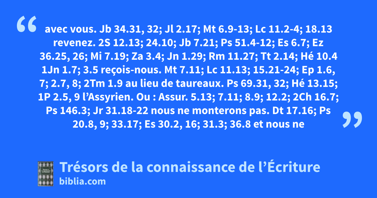 avec vous. Jb 34.31, 32; Jl 2.17; Mt 6.9-13; Lc 11.2-4; 18.13 revenez. 2S 12.13; 24.10; Jb 7.21; Ps 51.4-12; Es 6.7; Ez 36.25, 26; Mi 7.19; Za 3.4; Jn 1.29; Rm 11.27; Tt 2.14; Hé 10.4 1Jn 1.7; 3.5 reçois-nous. Mt 7.11; Lc 11.13; 15.21-24; Ep 1.6, 7; 2.7, 8; 2Tm 1.9 au lieu de taureaux. Ps 69.31, 32; Hé 13.15; 1P 2.5, 9