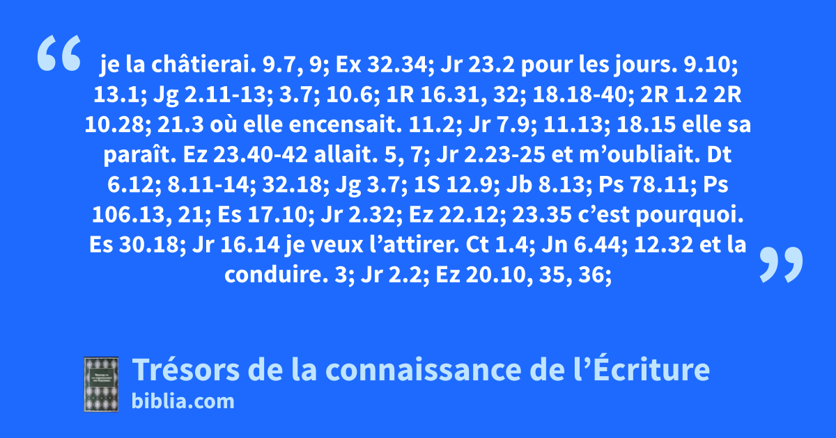 je la châtierai. 9.7, 9; Ex 32.34; Jr 23.2 pour les jours. 9.10; 13.1; Jg 2.11-13; 3.7; 10.6; 1R 16.31, 32; 18.18-40; 2R 1.2 2R 10.28; 21.3 où elle encensait. 11.2; Jr 7.9; 11.13; 18.15 elle sa paraît. Ez 23.40-42 allait. 5, 7; Jr 2.23-25 et m’oubliait. Dt 6.12; 8.11-14; 32.18; Jg 3.7; 1S 12.9; Jb 8.13; Ps 78.11; Ps 106.13, 21; Es 17.10; Jr 2.32; Ez 22.12; 23.35