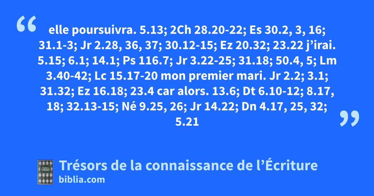 elle poursuivra. 5.13; 2Ch 28.20-22; Es 30.2, 3, 16; 31.1-3; Jr 2.28, 36, 37; 30.12-15; Ez 20.32; 23.22 j’irai. 5.15; 6.1; 14.1; Ps 116.7; Jr 3.22-25; 31.18; 50.4, 5; Lm 3.40-42; Lc 15.17-20 mon premier mari. Jr 2.2; 3.1; 31.32; Ez 16.18; 23.4 car alors. 13.6; Dt 6.10-12; 8.17, 18; 32.13-15; Né 9.25, 26; Jr 14.22; Dn 4.17, 25, 32; 5.21
