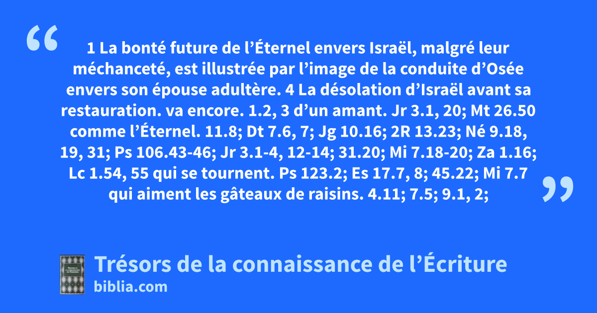 va encore. 1.2, 3 d’un amant. Jr 3.1, 20; Mt 26.50 comme l’Éternel. 11.8; Dt 7.6, 7; Jg 10.16; 2R 13.23; Né 9.18, 19, 31; Ps 106.43-46; Jr 3.1-4, 12-14; 31.20; Mi 7.18-20; Za 1.16; Lc 1.54, 55 qui se tournent. Ps 123.2; Es 17.7, 8; 45.22; Mi 7.7 qui aiment les gâteaux de raisins. 4.11; 7.5; 9.1, 2; Ex 32.6; Jg 9.27; Am 2.8; 6.6; 1Co 10.7, 21; 1P 4.3