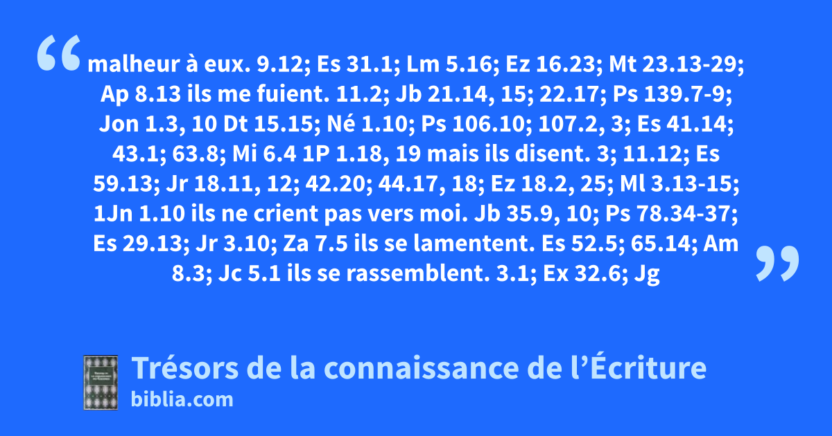 malheur à eux. 9.12; Es 31.1; Lm 5.16; Ez 16.23; Mt 23.13-29; Ap 8.13 ils me fuient. 11.2; Jb 21.14, 15; 22.17; Ps 139.7-9; Jon 1.3, 10 Dt 15.15; Né 1.10; Ps 106.10; 107.2, 3; Es 41.14; 43.1; 63.8; Mi 6.4 1P 1.18, 19 mais ils disent. 3; 11.12; Es 59.13; Jr 18.11, 12; 42.20; 44.17, 18; Ez 18.2, 25; Ml 3.13-15; 1Jn 1.10