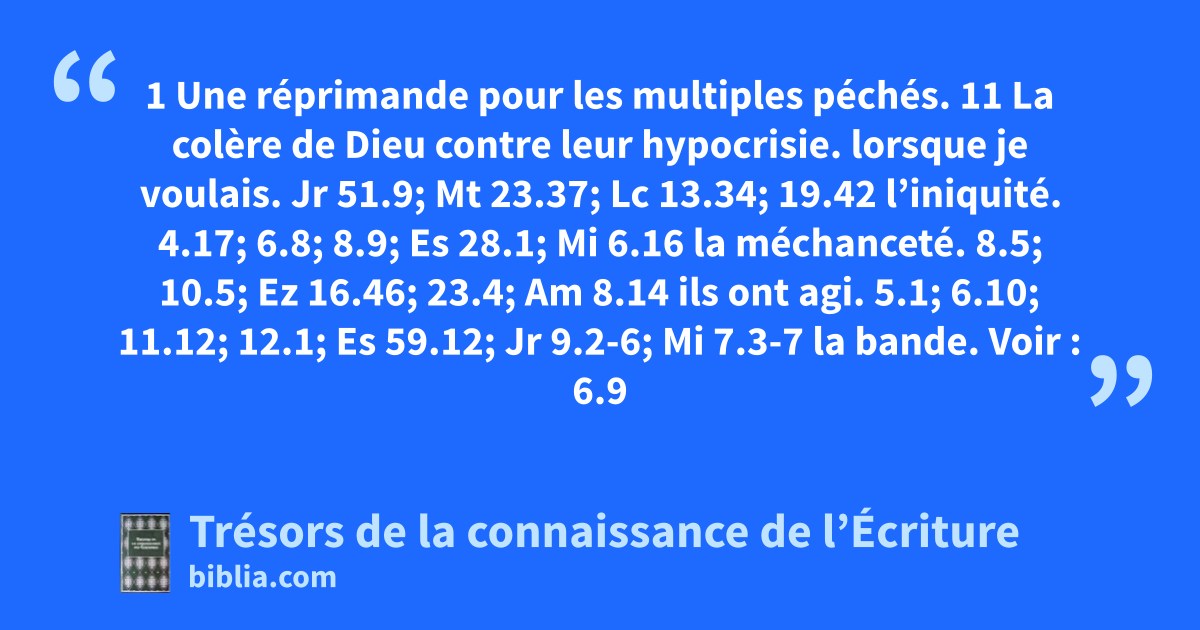 lorsque je voulais. Jr 51.9; Mt 23.37; Lc 13.34; 19.42 l’iniquité. 4.17; 6.8; 8.9; Es 28.1; Mi 6.16 la méchanceté. 8.5; 10.5; Ez 16.46; 23.4; Am 8.14 ils ont agi. 5.1; 6.10; 11.12; 12.1; Es 59.12; Jr 9.2-6; Mi 7.3-7 la bande. Voir : 6.9