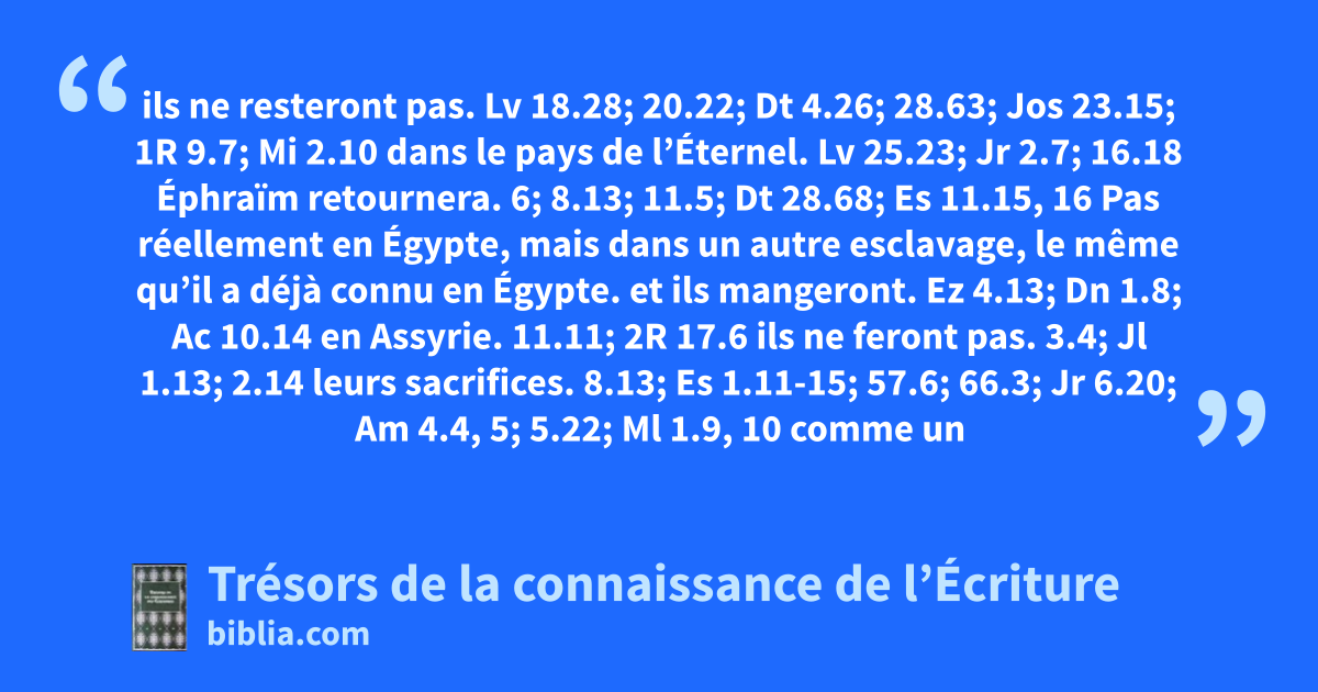 ils ne resteront pas. Lv 18.28; 20.22; Dt 4.26; 28.63; Jos 23.15; 1R 9.7; Mi 2.10 dans le pays de l’Éternel. Lv 25.23; Jr 2.7; 16.18 Éphraïm retournera. 6; 8.13; 11.5; Dt 28.68; Es 11.15, 16 Pas réellement en Égypte, mais dans un autre esclavage, le même qu’il a déjà connu en Égypte. et ils mangeront. Ez 4.13; Dn 1.8; Ac 10.14 en Assyrie. 11.11; 2R 17.6