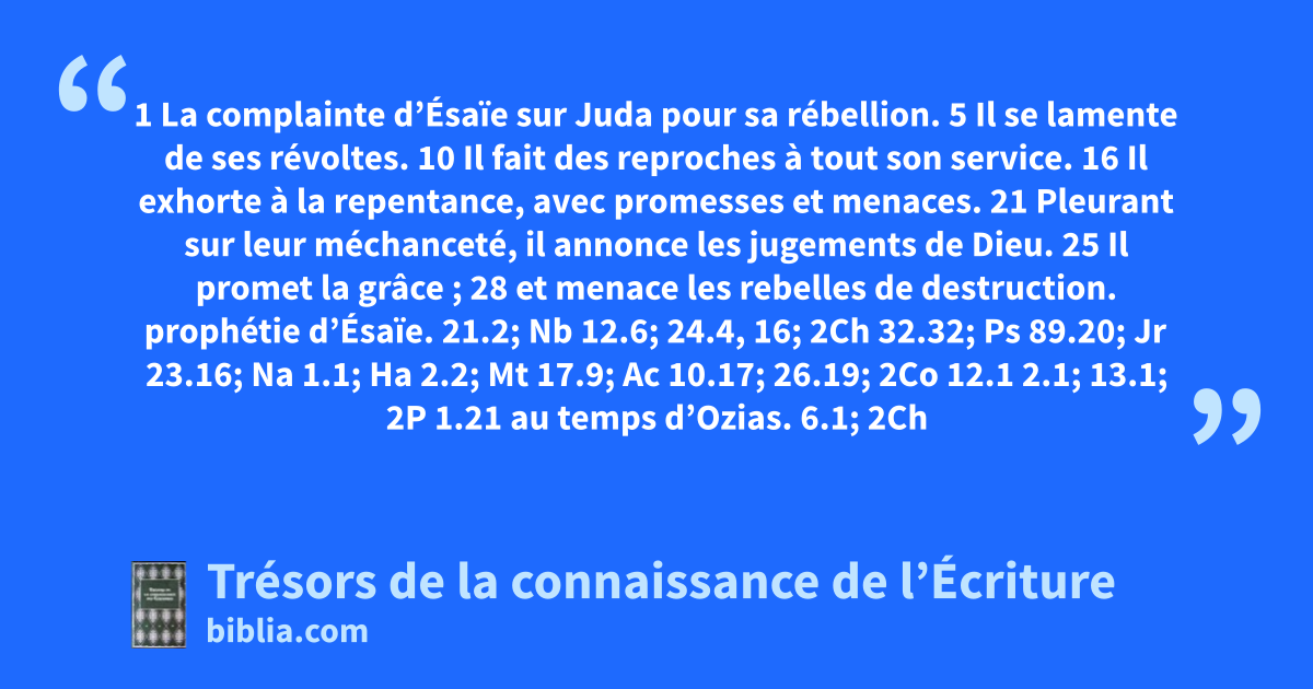 1 La complainte d’Ésaïe sur Juda pour sa rébellion. 5 Il se lamente de ses révoltes. 10 Il fait des reproches à tout son service. 16 Il exhorte à la repentance, avec promesses et menaces. 21 Pleurant sur leur méchanceté, il annonce les jugements de Dieu. 25 Il promet la grâce ; 28 et menace les rebelles de destruction.