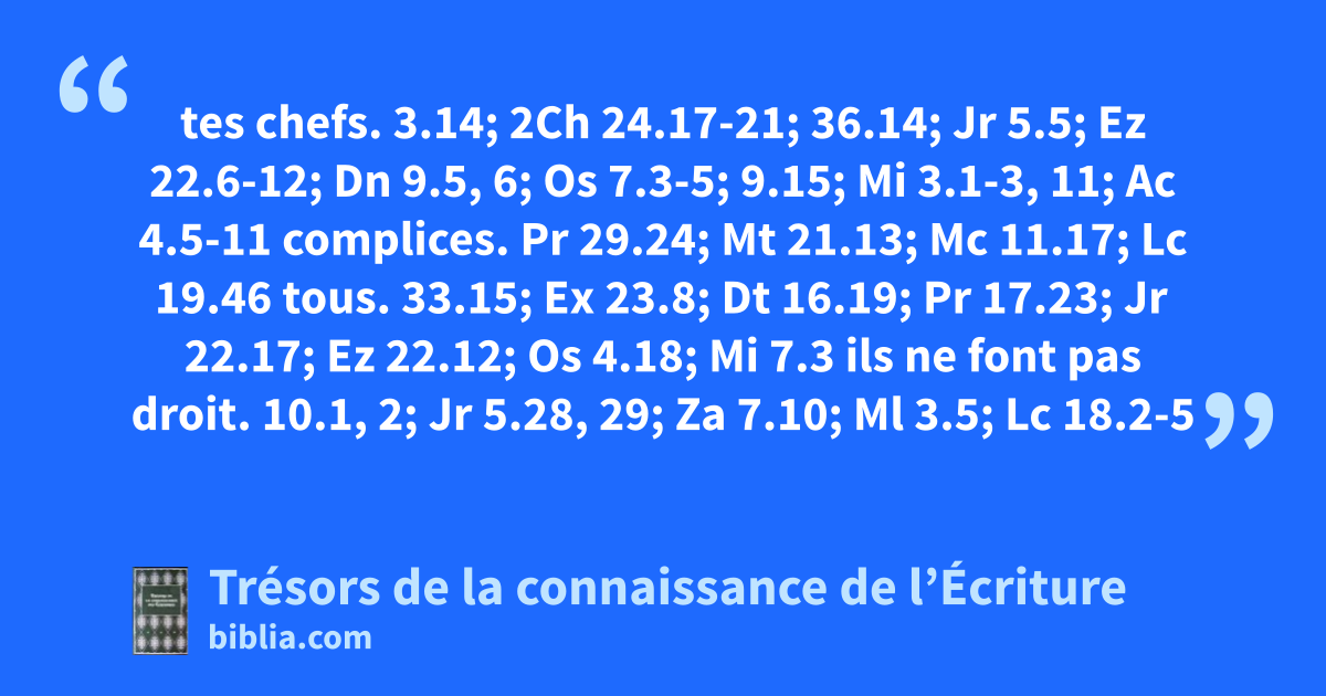 tes chefs. 3.14; 2Ch 24.17-21; 36.14; Jr 5.5; Ez 22.6-12; Dn 9.5, 6; Os 7.3-5; 9.15; Mi 3.1-3, 11; Ac 4.5-11 complices. Pr 29.24; Mt 21.13; Mc 11.17; Lc 19.46 tous. 33.15; Ex 23.8; Dt 16.19; Pr 17.23; Jr 22.17; Ez 22.12; Os 4.18; Mi 7.3 ils ne font pas droit. 10.1, 2; Jr 5.28, 29; Za 7.10; Ml 3.5; Lc 18.2-5