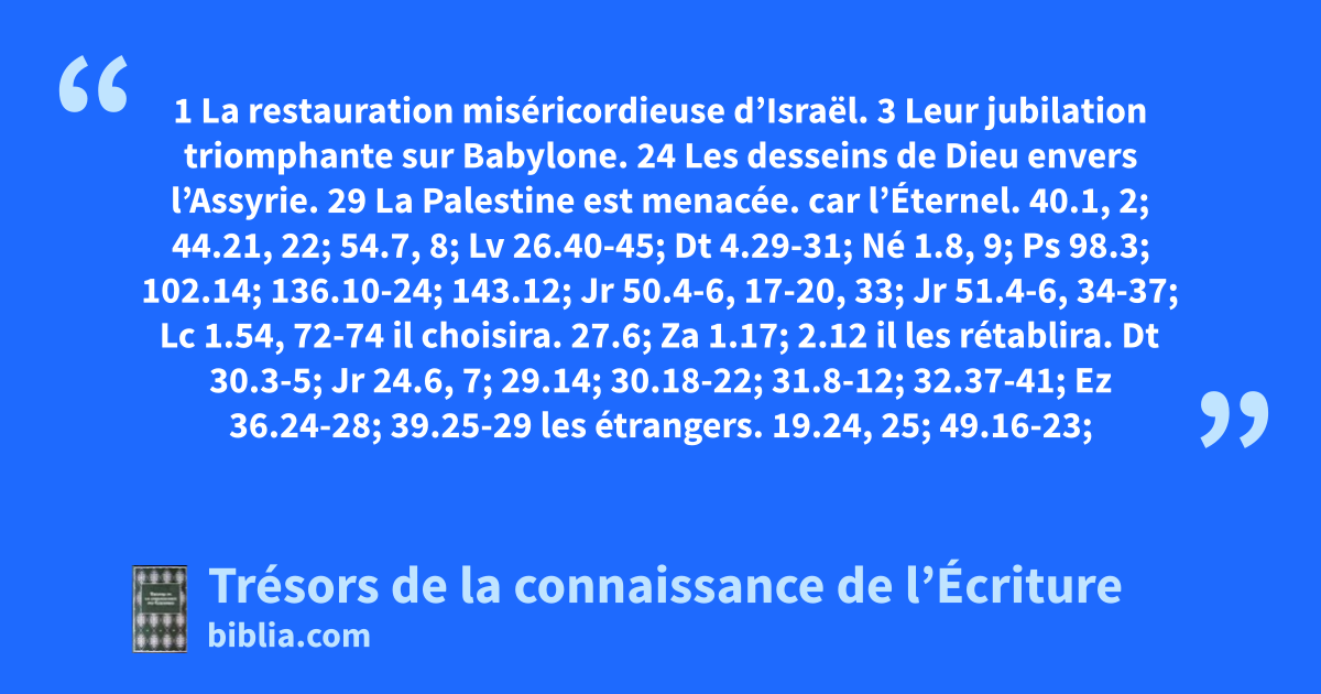 car l’Éternel. 40.1, 2; 44.21, 22; 54.7, 8; Lv 26.40-45; Dt 4.29-31; Né 1.8, 9; Ps 98.3; 102.14; 136.10-24; 143.12; Jr 50.4-6, 17-20, 33; Jr 51.4-6, 34-37; Lc 1.54, 72-74 il choisira. 27.6; Za 1.17; 2.12 il les rétablira. Dt 30.3-5; Jr 24.6, 7; 29.14; 30.18-22; 31.8-12; 32.37-41; Ez 36.24-28; 39.25-29 les étrangers. 19.24, 25; 49.16-23; 56.6-8; 60.3-5; 66.20; Rt 1.14-18; Est 8.17; Jr 12.15, 16; Za 2.11; 8.22, 23; Ml 1.11; Lc 2.32; Ac 15.14-17; Ep 2.12-19