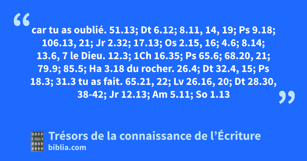 car tu as oublié. 51.13; Dt 6.12; 8.11, 14, 19; Ps 9.18; 106.13, 21; Jr 2.32; 17.13; Os 2.15, 16; 4.6; 8.14; 13.6, 7 le Dieu. 12.3; 1Ch 16.35; Ps 65.6; 68.20, 21; 79.9; 85.5; Ha 3.18 du rocher. 26.4; Dt 32.4, 15; Ps 18.3; 31.3 tu as fait. 65.21, 22; Lv 26.16, 20; Dt 28.30, 38-42; Jr 12.13; Am 5.11; So 1.13