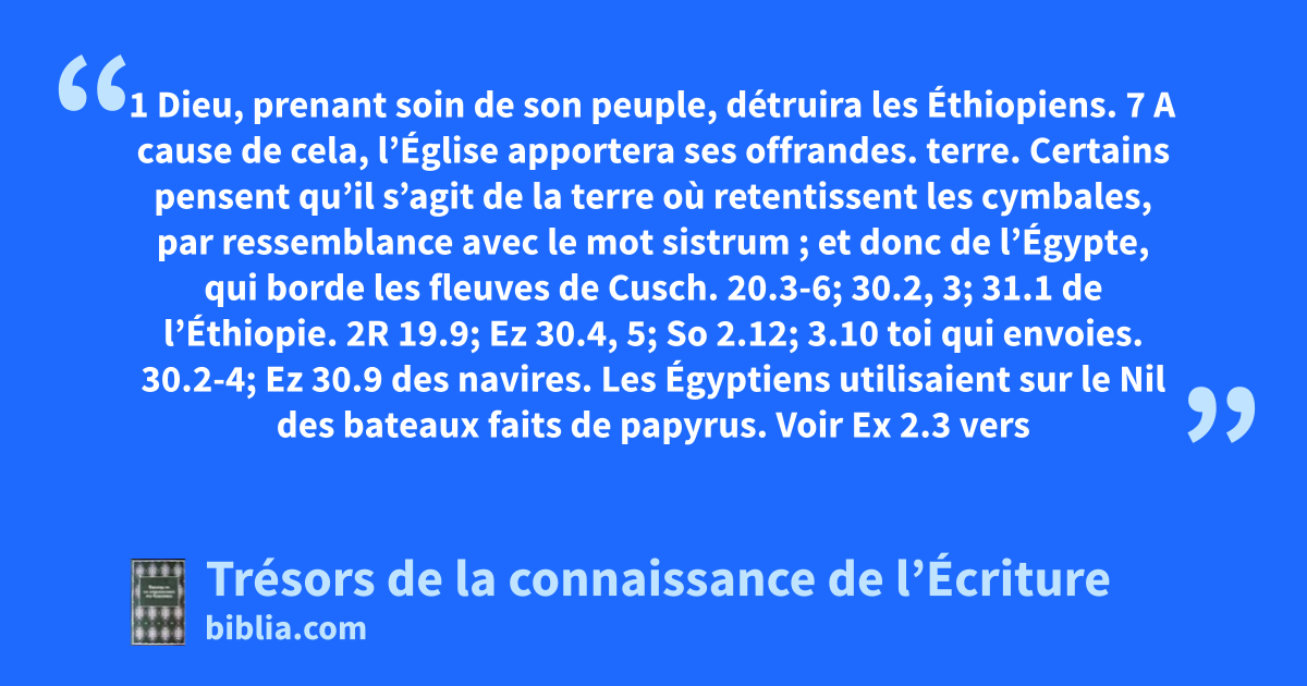 terre. Certains pensent qu’il s’agit de la terre où retentissent les cymbales, par ressemblance avec le mot sistrum ; et donc de l’Égypte, qui borde les fleuves de Cusch. 20.3-6; 30.2, 3; 31.1 de l’Éthiopie. 2R 19.9; Ez 30.4, 5; So 2.12; 3.10
