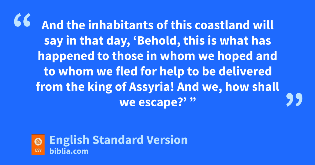 3 Then the Lord said, “As my servant Isaiah has walked naked and barefoot for three years oas a sign and a portent against Egypt and Cush,1 4 so shall the pking of Assyria lead away the Egyptian captives and the Cushite exiles, both the young and the old, naked and barefoot, with buttocks uncovered, the nakedness of Egypt. 5 qThen they shall be dismayed and ashamed because of Cush their hope and of Egypt their boast. 6 And the inhabitants of rthis coastland will say in that day, ‘Behold, this is what has happened to those in whom we hoped and sto whom we fled for help to be delivered from the king of Assyria! And we, how shall we escape?’ ”
