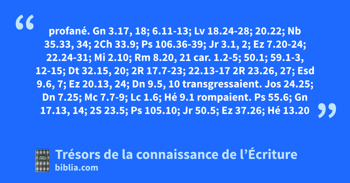 profané. Gn 3.17, 18; 6.11-13; Lv 18.24-28; 20.22; Nb 35.33, 34; 2Ch 33.9; Ps 106.36-39; Jr 3.1, 2; Ez 7.20-24; 22.24-31; Mi 2.10; Rm 8.20, 21 car. 1.2-5; 50.1; 59.1-3, 12-15; Dt 32.15, 20; 2R 17.7-23; 22.13-17 2R 23.26, 27; Esd 9.6, 7; Ez 20.13, 24; Dn 9.5, 10 transgressaient. Jos 24.25; Dn 7.25; Mc 7.7-9; Lc 1.6; Hé 9.1 rompaient. Ps 55.6; Gn 17.13, 14; 2S 23.5; Ps 105.10; Jr 50.5; Ez 37.26; Hé 13.20