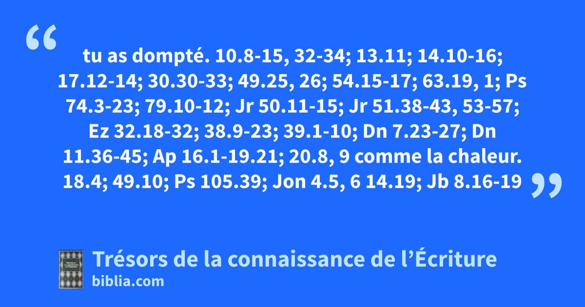 tu as dompté. 10.8-15, 32-34; 13.11; 14.10-16; 17.12-14; 30.30-33; 49.25, 26; 54.15-17; 63.19, 1; Ps 74.3-23; 79.10-12; Jr 50.11-15; Jr 51.38-43, 53-57; Ez 32.18-32; 38.9-23; 39.1-10; Dn 7.23-27; Dn 11.36-45; Ap 16.1-19.21; 20.8, 9 comme la chaleur. 18.4; 49.10; Ps 105.39; Jon 4.5, 6 14.19; Jb 8.16-19