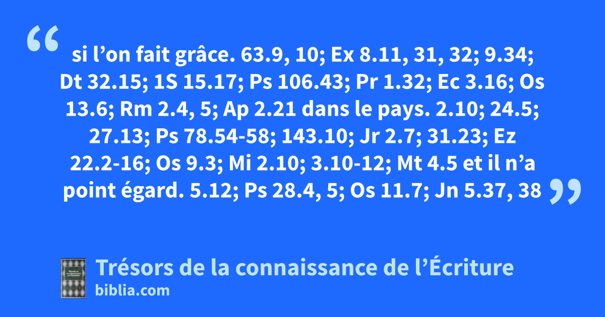si l’on fait grâce. 63.9, 10; Ex 8.11, 31, 32; 9.34; Dt 32.15; 1S 15.17; Ps 106.43; Pr 1.32; Ec 3.16; Os 13.6; Rm 2.4, 5; Ap 2.21 dans le pays. 2.10; 24.5; 27.13; Ps 78.54-58; 143.10; Jr 2.7; 31.23; Ez 22.2-16; Os 9.3; Mi 2.10; 3.10-12; Mt 4.5 et il n’a point égard. 5.12; Ps 28.4, 5; Os 11.7; Jn 5.37, 38