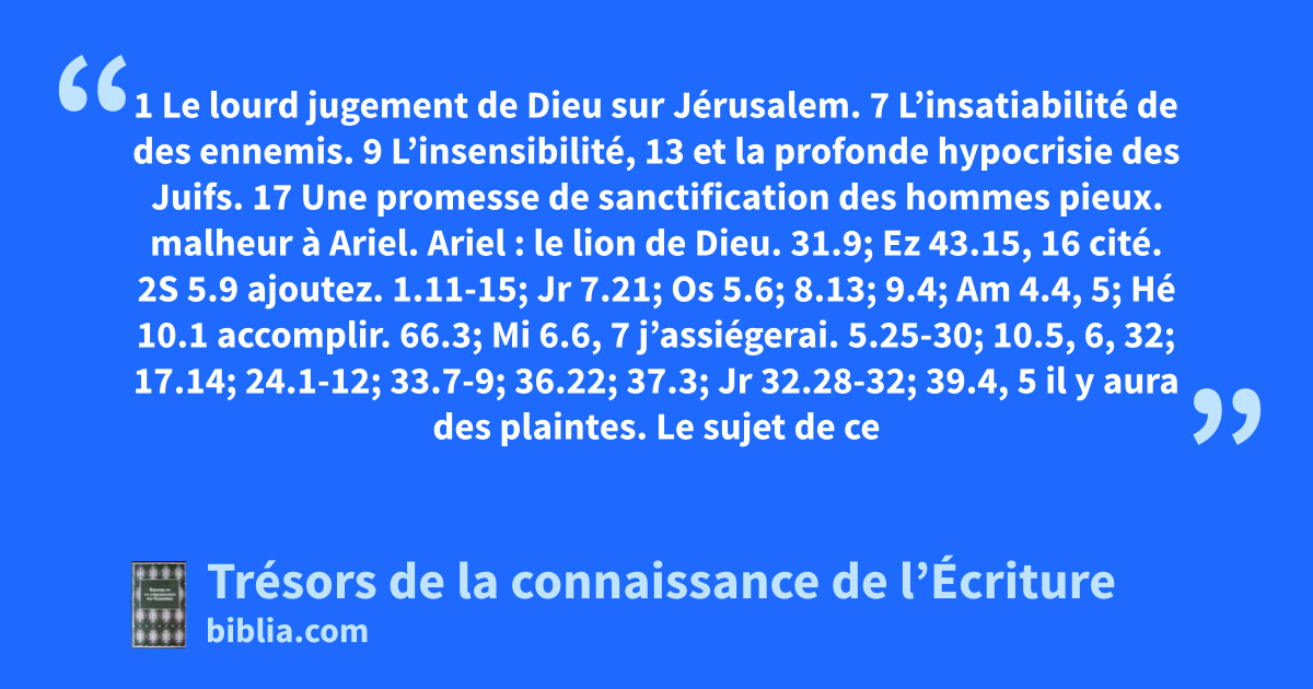 malheur à Ariel. Ariel : le lion de Dieu. 31.9; Ez 43.15, 16 cité. 2S 5.9 ajoutez. 1.11-15; Jr 7.21; Os 5.6; 8.13; 9.4; Am 4.4, 5; Hé 10.1 accomplir. 66.3; Mi 6.6, 7
