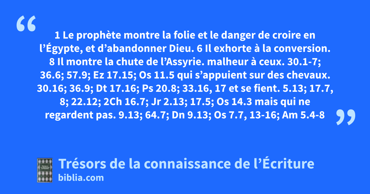 malheur à ceux. 30.1-7; 36.6; 57.9; Ez 17.15; Os 11.5 qui s’appuient sur des chevaux. 30.16; 36.9; Dt 17.16; Ps 20.8; 33.16, 17 et se fient. 5.13; 17.7, 8; 22.12; 2Ch 16.7; Jr 2.13; 17.5; Os 14.3 mais qui ne regardent pas. 9.13; 64.7; Dn 9.13; Os 7.7, 13-16; Am 5.4-8