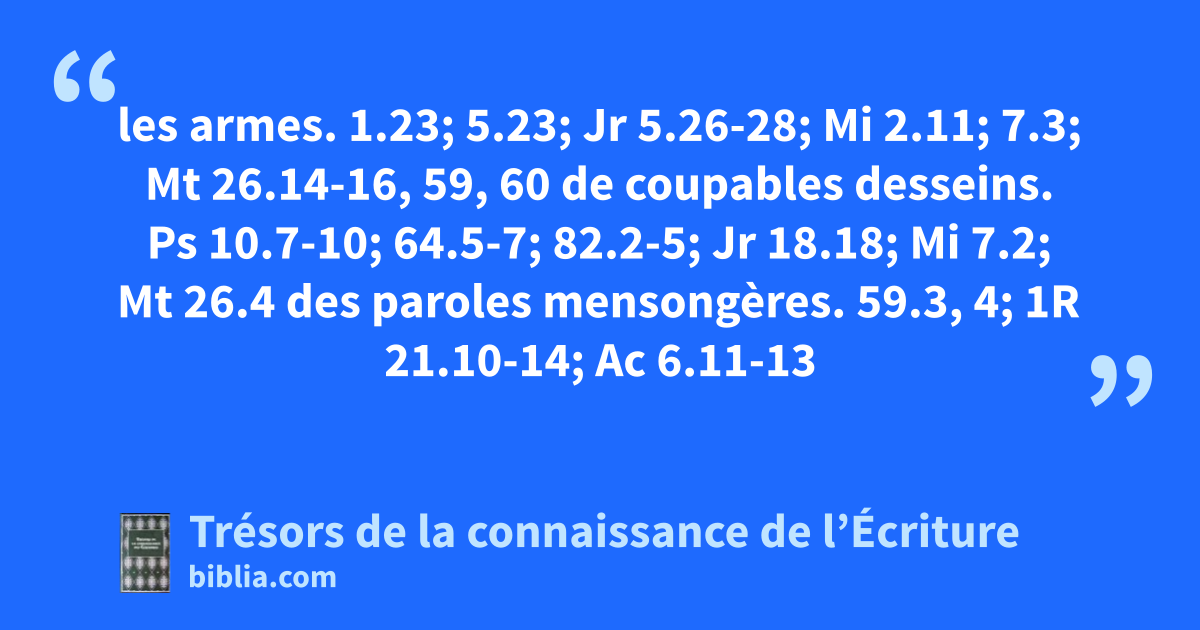 les armes. 1.23; 5.23; Jr 5.26-28; Mi 2.11; 7.3; Mt 26.14-16, 59, 60 de coupables desseins. Ps 10.7-10; 64.5-7; 82.2-5; Jr 18.18; Mi 7.2; Mt 26.4 des paroles mensongères. 59.3, 4; 1R 21.10-14; Ac 6.11-13