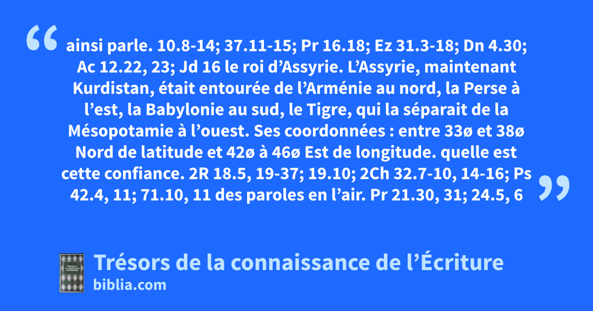ainsi parle. 10.8-14; 37.11-15; Pr 16.18; Ez 31.3-18; Dn 4.30; Ac 12.22, 23; Jd 16 le roi d’Assyrie. L’Assyrie, maintenant Kurdistan, était entourée de l’Arménie au nord, la Perse à l’est, la Babylonie au sud, le Tigre, qui la séparait de la Mésopotamie à l’ouest. Ses coordonnées : entre 33ø et 38ø Nord de latitude et 42ø à 46ø Est de longitude. quelle est cette confiance. 2R 18.5, 19-37; 19.10; 2Ch 32.7-10, 14-16; Ps 42.4, 11; 71.10, 11