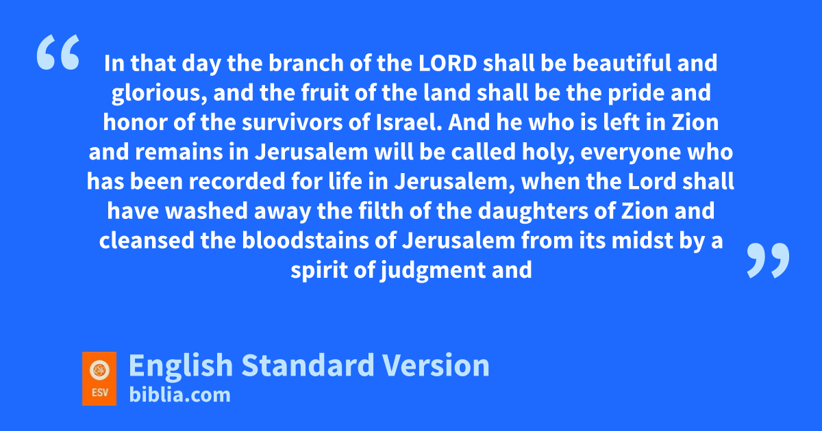 2 In that day ithe branch of the Lord shall be beautiful and glorious, and jthe fruit of the land shall be the pride and honor of the survivors of Israel. 3 kAnd he who is left in Zion and remains in Jerusalem will be called lholy, everyone who has mbeen recorded for life in Jerusalem, 4 when nthe Lord shall have washed away the filth of othe daughters of Zion and cleansed the bloodstains of Jerusalem from its midst by a spirit of judgment and by pa spirit of burning.1 5 Then the Lord will create over the whole site of Mount Zion and over her assemblies qa cloud by day, and smoke and the shining of a flaming fire by night; for over all the glory there will be ra canopy. 6 sThere will be a tbooth for shade by day from the heat, and ufor a refuge and a shelter from the storm and rain.