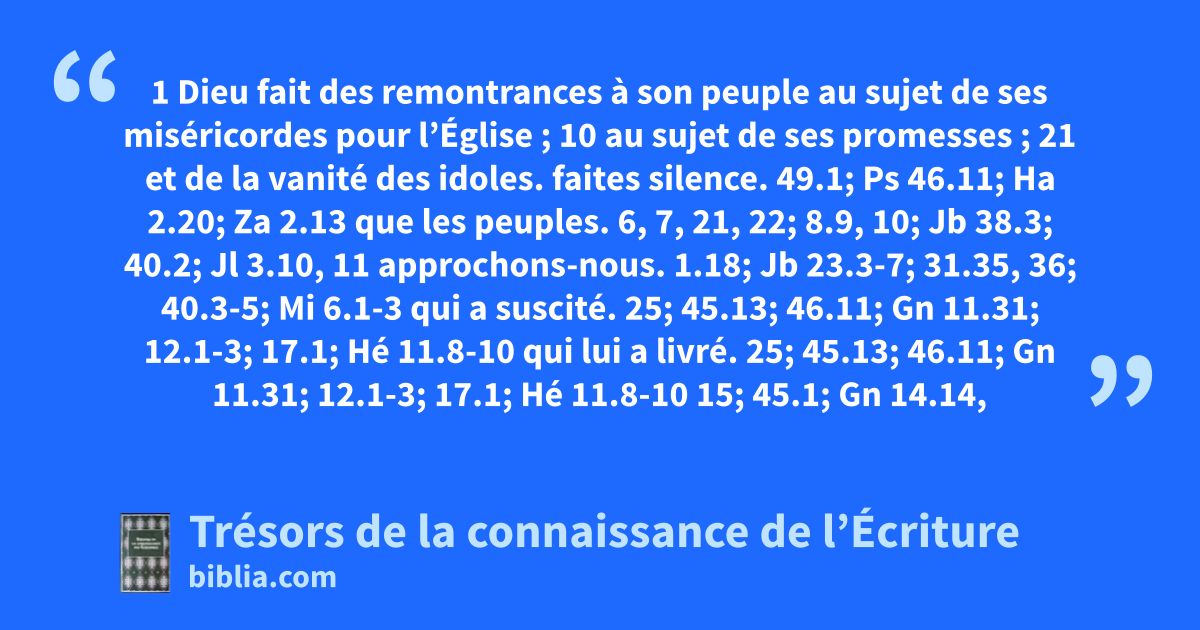 1 Dieu fait des remontrances à son peuple au sujet de ses miséricordes pour l’Église ; 10 au sujet de ses promesses ; 21 et de la vanité des idoles.