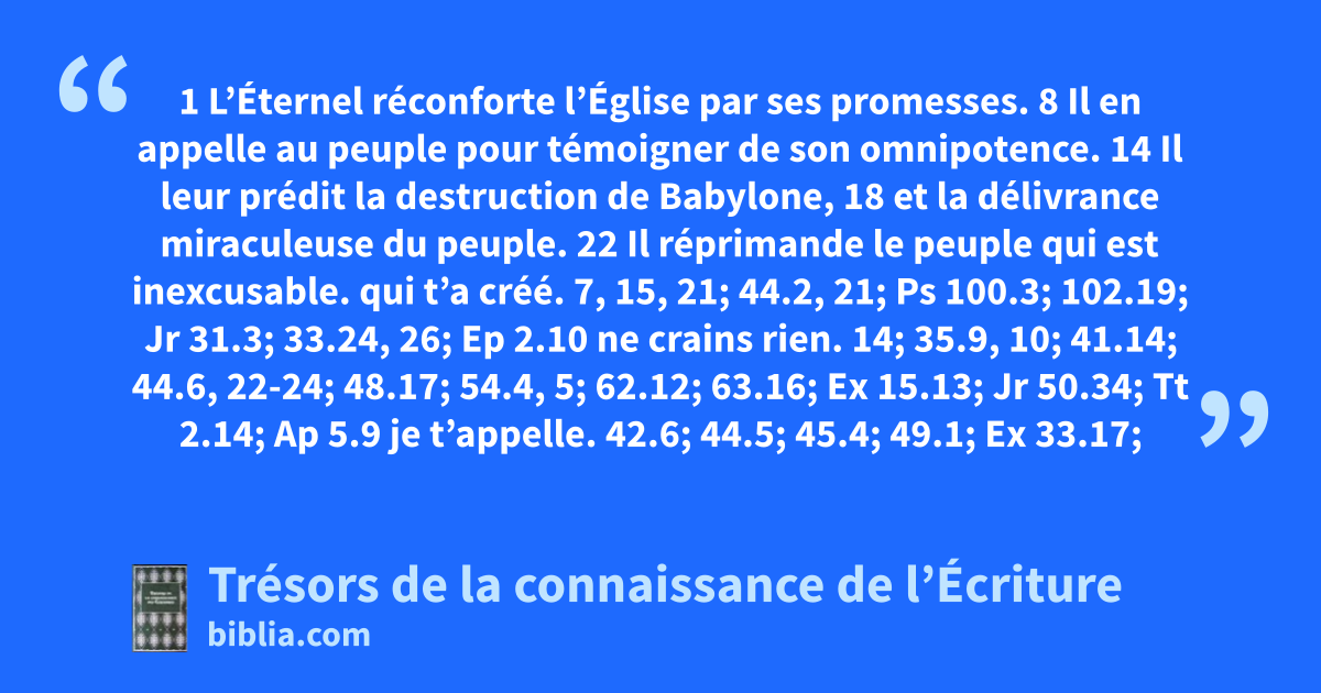 1 L’Éternel réconforte l’Église par ses promesses. 8 Il en appelle au peuple pour témoigner de son omnipotence. 14 Il leur prédit la destruction de Babylone, 18 et la délivrance miraculeuse du peuple. 22 Il réprimande le peuple qui est inexcusable.