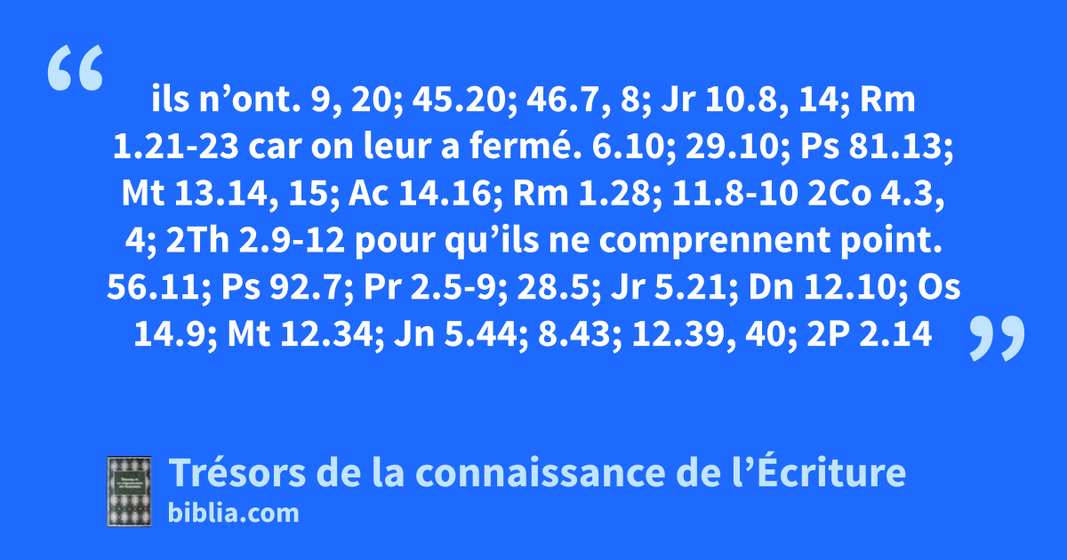 ils n’ont. 9, 20; 45.20; 46.7, 8; Jr 10.8, 14; Rm 1.21-23 car on leur a fermé. 6.10; 29.10; Ps 81.13; Mt 13.14, 15; Ac 14.16; Rm 1.28; 11.8-10 2Co 4.3, 4; 2Th 2.9-12 pour qu’ils ne comprennent point. 56.11; Ps 92.7; Pr 2.5-9; 28.5; Jr 5.21; Dn 12.10; Os 14.9; Mt 12.34; Jn 5.44; 8.43; 12.39, 40; 2P 2.14