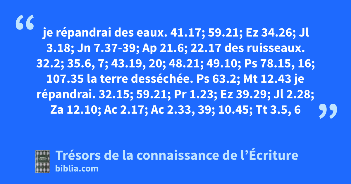 je répandrai des eaux. 41.17; 59.21; Ez 34.26; Jl 3.18; Jn 7.37-39; Ap 21.6; 22.17 des ruisseaux. 32.2; 35.6, 7; 43.19, 20; 48.21; 49.10; Ps 78.15, 16; 107.35 la terre desséchée. Ps 63.2; Mt 12.43 je répandrai. 32.15; 59.21; Pr 1.23; Ez 39.29; Jl 2.28; Za 12.10; Ac 2.17; Ac 2.33, 39; 10.45; Tt 3.5, 6