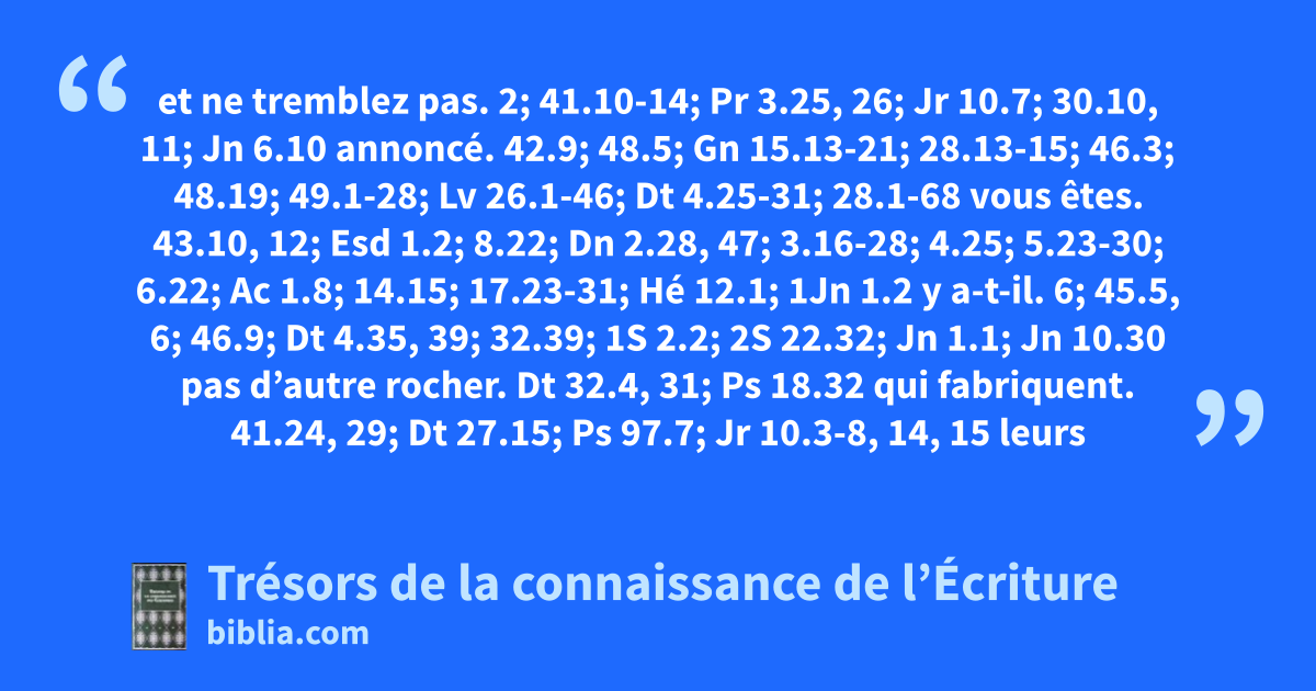 et ne tremblez pas. 2; 41.10-14; Pr 3.25, 26; Jr 10.7; 30.10, 11; Jn 6.10 annoncé. 42.9; 48.5; Gn 15.13-21; 28.13-15; 46.3; 48.19; 49.1-28; Lv 26.1-46; Dt 4.25-31; 28.1-68 vous êtes. 43.10, 12; Esd 1.2; 8.22; Dn 2.28, 47; 3.16-28; 4.25; 5.23-30; 6.22; Ac 1.8; 14.15; 17.23-31; Hé 12.1; 1Jn 1.2 y a-t-il. 6; 45.5, 6; 46.9; Dt 4.35, 39; 32.39; 1S 2.2; 2S 22.32; Jn 1.1; Jn 10.30 pas d’autre rocher. Dt 32.4, 31; Ps 18.32