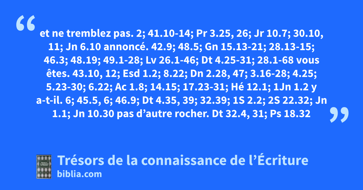 et ne tremblez pas. 2; 41.10-14; Pr 3.25, 26; Jr 10.7; 30.10, 11; Jn 6.10 annoncé. 42.9; 48.5; Gn 15.13-21; 28.13-15; 46.3; 48.19; 49.1-28; Lv 26.1-46; Dt 4.25-31; 28.1-68 vous êtes. 43.10, 12; Esd 1.2; 8.22; Dn 2.28, 47; 3.16-28; 4.25; 5.23-30; 6.22; Ac 1.8; 14.15; 17.23-31; Hé 12.1; 1Jn 1.2 y a-t-il. 6; 45.5, 6; 46.9; Dt 4.35, 39; 32.39; 1S 2.2; 2S 22.32; Jn 1.1; Jn 10.30 pas d’autre rocher. Dt 32.4, 31; Ps 18.32