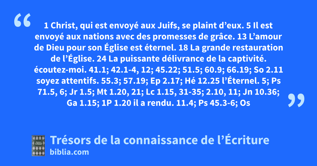 1 Christ, qui est envoyé aux Juifs, se plaint d’eux. 5 Il est envoyé aux nations avec des promesses de grâce. 13 L’amour de Dieu pour son Église est éternel. 18 La grande restauration de l’Église. 24 La puissante délivrance de la captivité.