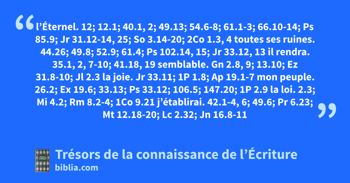l’Éternel. 12; 12.1; 40.1, 2; 49.13; 54.6-8; 61.1-3; 66.10-14; Ps 85.9; Jr 31.12-14, 25; So 3.14-20; 2Co 1.3, 4 toutes ses ruines. 44.26; 49.8; 52.9; 61.4; Ps 102.14, 15; Jr 33.12, 13 il rendra. 35.1, 2, 7-10; 41.18, 19 semblable. Gn 2.8, 9; 13.10; Ez 31.8-10; Jl 2.3 la joie. Jr 33.11; 1P 1.8; Ap 19.1-7