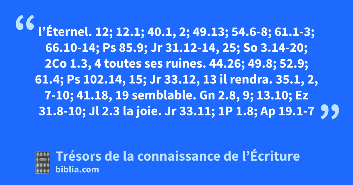 l’Éternel. 12; 12.1; 40.1, 2; 49.13; 54.6-8; 61.1-3; 66.10-14; Ps 85.9; Jr 31.12-14, 25; So 3.14-20; 2Co 1.3, 4 toutes ses ruines. 44.26; 49.8; 52.9; 61.4; Ps 102.14, 15; Jr 33.12, 13 il rendra. 35.1, 2, 7-10; 41.18, 19 semblable. Gn 2.8, 9; 13.10; Ez 31.8-10; Jl 2.3 la joie. Jr 33.11; 1P 1.8; Ap 19.1-7
