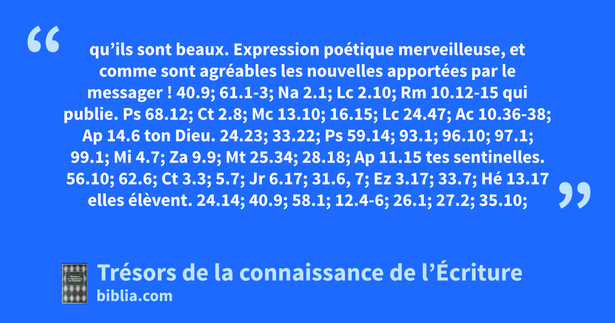 qu’ils sont beaux. Expression poétique merveilleuse, et comme sont agréables les nouvelles apportées par le messager ! 40.9; 61.1-3; Na 2.1; Lc 2.10; Rm 10.12-15 qui publie. Ps 68.12; Ct 2.8; Mc 13.10; 16.15; Lc 24.47; Ac 10.36-38; Ap 14.6 ton Dieu. 24.23; 33.22; Ps 59.14; 93.1; 96.10; 97.1; 99.1; Mi 4.7; Za 9.9; Mt 25.34; 28.18; Ap 11.15
