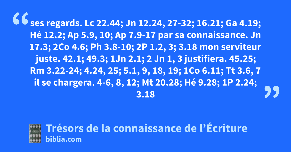 ses regards. Lc 22.44; Jn 12.24, 27-32; 16.21; Ga 4.19; Hé 12.2; Ap 5.9, 10; Ap 7.9-17 par sa connaissance. Jn 17.3; 2Co 4.6; Ph 3.8-10; 2P 1.2, 3; 3.18 mon serviteur juste. 42.1; 49.3; 1Jn 2.1; 2 Jn 1, 3 justifiera. 45.25; Rm 3.22-24; 4.24, 25; 5.1, 9, 18, 19; 1Co 6.11; Tt 3.6, 7 il se chargera. 4-6, 8, 12; Mt 20.28; Hé 9.28; 1P 2.24; 3.18