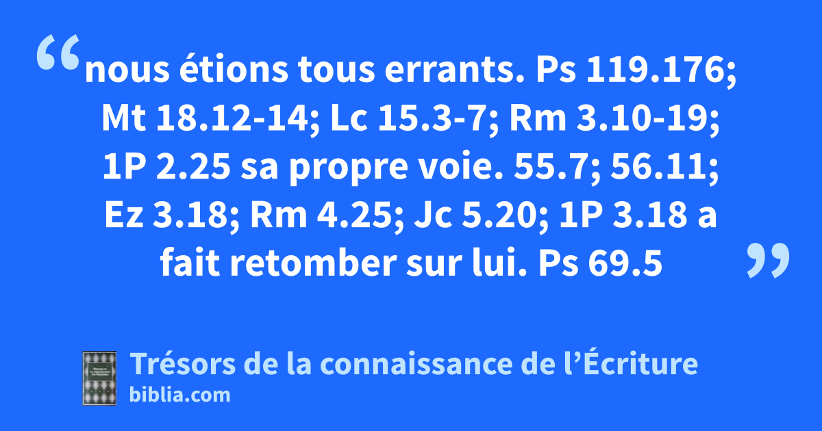 nous étions tous errants. Ps 119.176; Mt 18.12-14; Lc 15.3-7; Rm 3.10-19; 1P 2.25 sa propre voie. 55.7; 56.11; Ez 3.18; Rm 4.25; Jc 5.20; 1P 3.18 a fait retomber sur lui. Ps 69.5