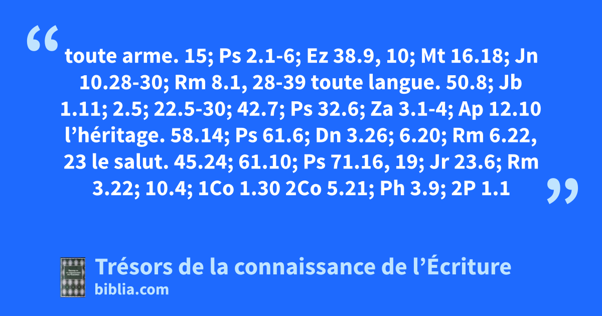 toute arme. 15; Ps 2.1-6; Ez 38.9, 10; Mt 16.18; Jn 10.28-30; Rm 8.1, 28-39 toute langue. 50.8; Jb 1.11; 2.5; 22.5-30; 42.7; Ps 32.6; Za 3.1-4; Ap 12.10 l’héritage. 58.14; Ps 61.6; Dn 3.26; 6.20; Rm 6.22, 23 le salut. 45.24; 61.10; Ps 71.16, 19; Jr 23.6; Rm 3.22; 10.4; 1Co 1.30 2Co 5.21; Ph 3.9; 2P 1.1