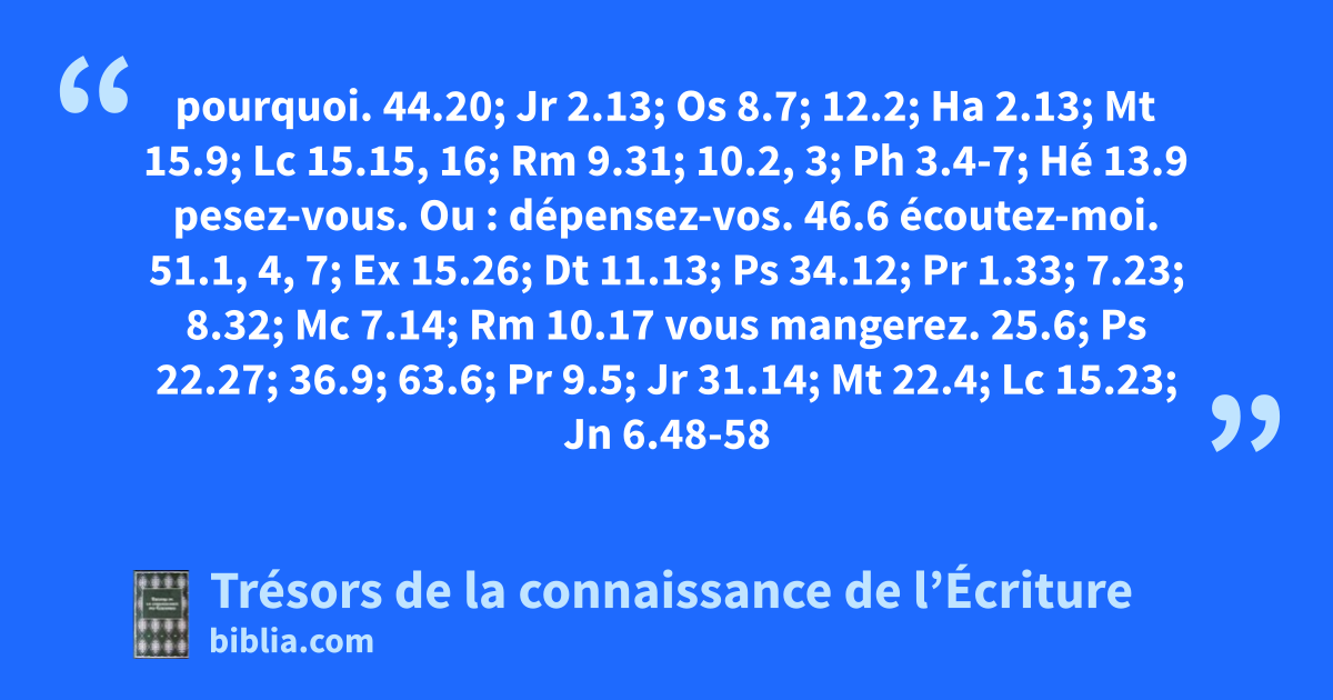 pourquoi. 44.20; Jr 2.13; Os 8.7; 12.2; Ha 2.13; Mt 15.9; Lc 15.15, 16; Rm 9.31; 10.2, 3; Ph 3.4-7; Hé 13.9 pesez-vous. Ou : dépensez-vos. 46.6 écoutez-moi. 51.1, 4, 7; Ex 15.26; Dt 11.13; Ps 34.12; Pr 1.33; 7.23; 8.32; Mc 7.14; Rm 10.17 vous mangerez. 25.6; Ps 22.27; 36.9; 63.6; Pr 9.5; Jr 31.14; Mt 22.4; Lc 15.23; Jn 6.48-58
