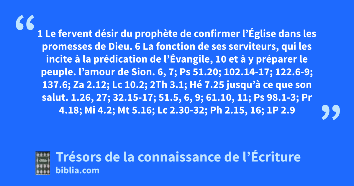 l’amour de Sion. 6, 7; Ps 51.20; 102.14-17; 122.6-9; 137.6; Za 2.12; Lc 10.2; 2Th 3.1; Hé 7.25 jusqu’à ce que son salut. 1.26, 27; 32.15-17; 51.5, 6, 9; 61.10, 11; Ps 98.1-3; Pr 4.18; Mi 4.2; Mt 5.16; Lc 2.30-32; Ph 2.15, 16; 1P 2.9