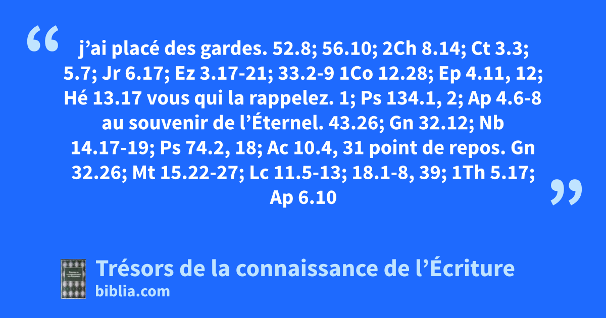 j’ai placé des gardes. 52.8; 56.10; 2Ch 8.14; Ct 3.3; 5.7; Jr 6.17; Ez 3.17-21; 33.2-9 1Co 12.28; Ep 4.11, 12; Hé 13.17 vous qui la rappelez. 1; Ps 134.1, 2; Ap 4.6-8 au souvenir de l’Éternel. 43.26; Gn 32.12; Nb 14.17-19; Ps 74.2, 18; Ac 10.4, 31 point de repos. Gn 32.26; Mt 15.22-27; Lc 11.5-13; 18.1-8, 39; 1Th 5.17; Ap 6.10