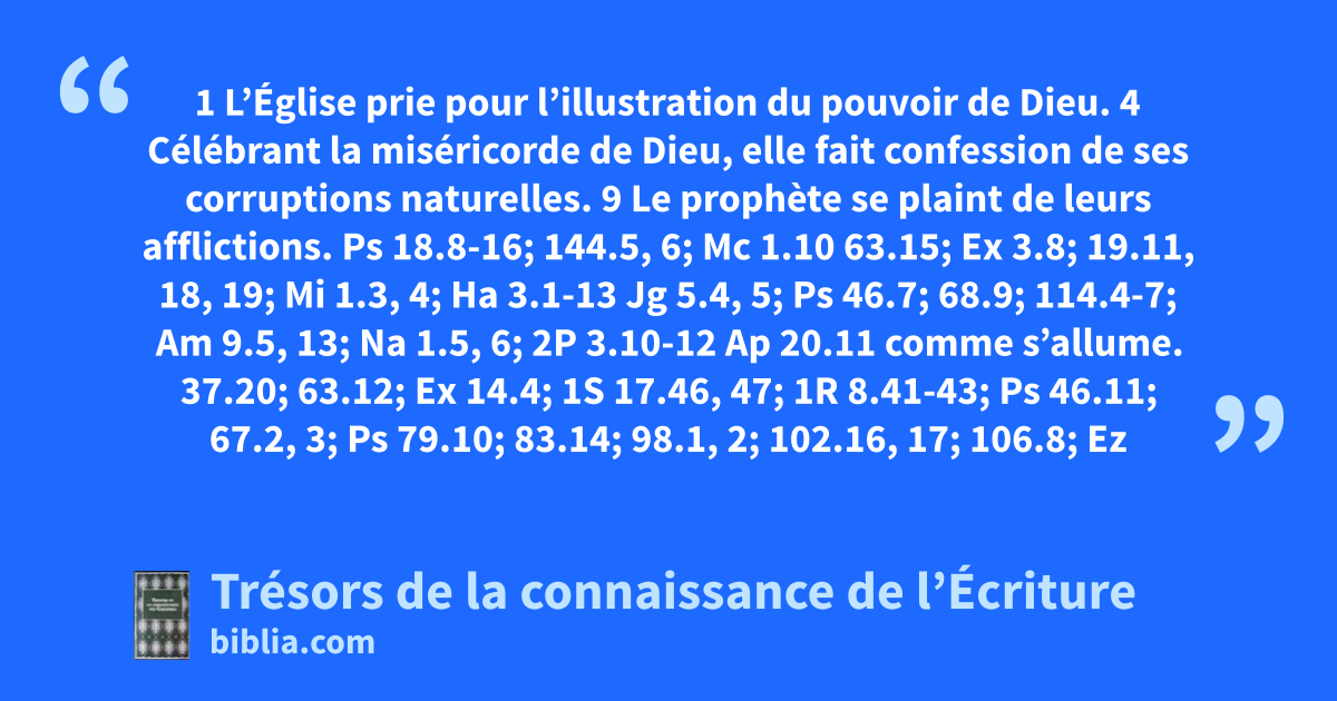 1 L’Église prie pour l’illustration du pouvoir de Dieu. 4 Célébrant la miséricorde de Dieu, elle fait confession de ses corruptions naturelles. 9 Le prophète se plaint de leurs afflictions.