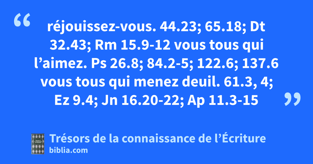 réjouissez-vous. 44.23; 65.18; Dt 32.43; Rm 15.9-12 vous tous qui l’aimez. Ps 26.8; 84.2-5; 122.6; 137.6 vous tous qui menez deuil. 61.3, 4; Ez 9.4; Jn 16.20-22; Ap 11.3-15