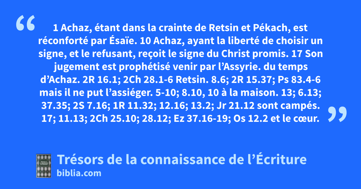 1 Achaz, étant dans la crainte de Retsin et Pékach, est réconforté par Ésaïe. 10 Achaz, ayant la liberté de choisir un signe, et le refusant, reçoit le signe du Christ promis.