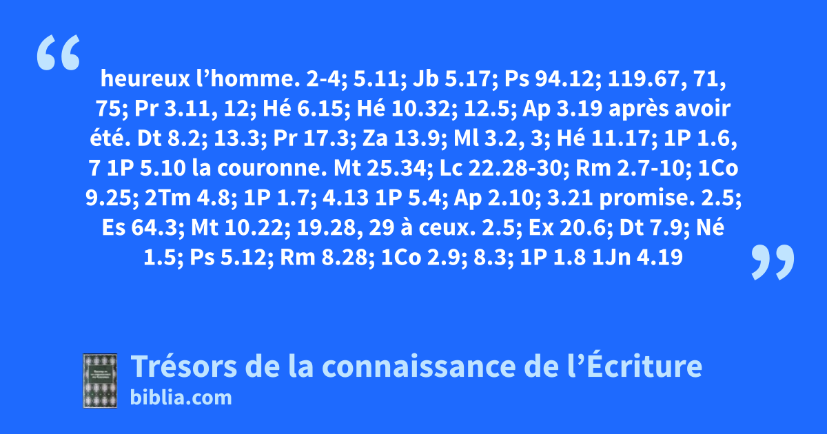 heureux l’homme. 2-4; 5.11; Jb 5.17; Ps 94.12; 119.67, 71, 75; Pr 3.11, 12; Hé 6.15; Hé 10.32; 12.5; Ap 3.19 après avoir été. Dt 8.2; 13.3; Pr 17.3; Za 13.9; Ml 3.2, 3; Hé 11.17; 1P 1.6, 7 1P 5.10 la couronne. Mt 25.34; Lc 22.28-30; Rm 2.7-10; 1Co 9.25; 2Tm 4.8; 1P 1.7; 4.13 1P 5.4; Ap 2.10; 3.21 promise. 2.5; Es 64.3; Mt 10.22; 19.28, 29 à ceux. 2.5; Ex 20.6; Dt 7.9; Né 1.5; Ps 5.12; Rm 8.28; 1Co 2.9; 8.3; 1P 1.8 1Jn 4.19