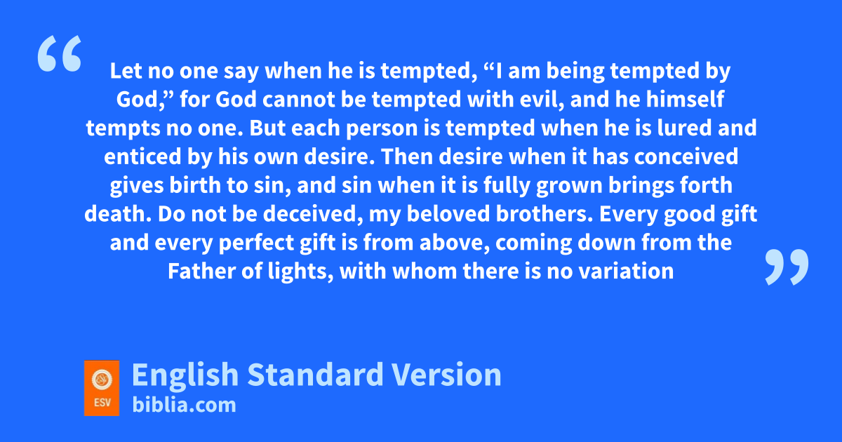 12 uBlessed is the man who remains steadfast under trial, for when he has stood the test he will receive vthe crown of life, wwhich God has promised to those who love him. 13 Let no one say when he is tempted, “I am being tempted by God,” for God cannot be tempted with evil, and he himself tempts no one. 14 But each person is tempted when he is lured and enticed by his own desire. 15 Then desire xwhen it has conceived gives birth to sin, and ysin when it is fully grown brings forth death.