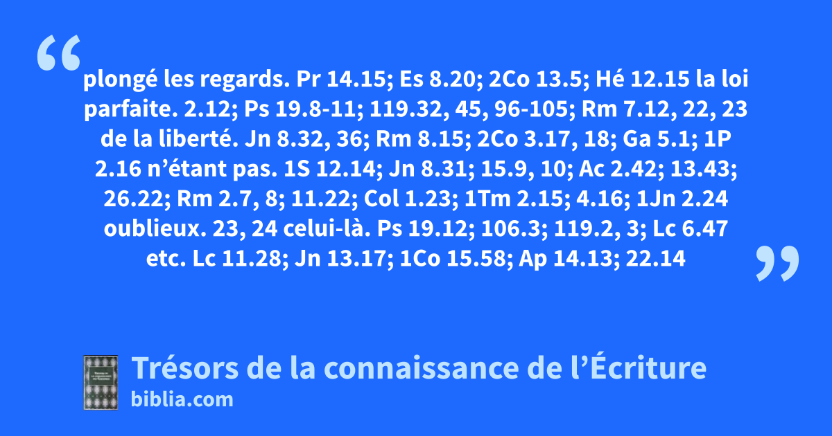 plongé les regards. Pr 14.15; Es 8.20; 2Co 13.5; Hé 12.15 la loi parfaite. 2.12; Ps 19.8-11; 119.32, 45, 96-105; Rm 7.12, 22, 23 de la liberté. Jn 8.32, 36; Rm 8.15; 2Co 3.17, 18; Ga 5.1; 1P 2.16 n’étant pas. 1S 12.14; Jn 8.31; 15.9, 10; Ac 2.42; 13.43; 26.22; Rm 2.7, 8; 11.22; Col 1.23; 1Tm 2.15; 4.16; 1Jn 2.24 oublieux. 23, 24 celui-là. Ps 19.12; 106.3; 119.2, 3; Lc 6.47 etc. Lc 11.28; Jn 13.17; 1Co 15.58; Ap 14.13; 22.14