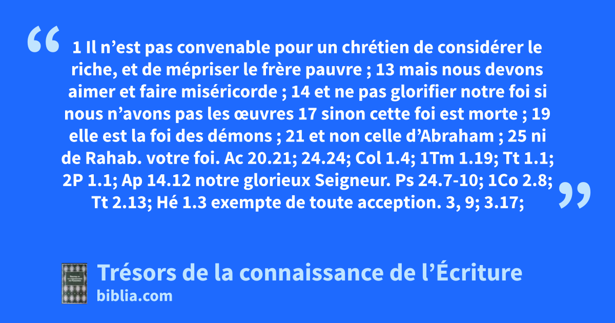 1 Il n’est pas convenable pour un chrétien de considérer le riche, et de mépriser le frère pauvre ; 13 mais nous devons aimer et faire miséricorde ; 14 et ne pas glorifier notre foi si nous n’avons pas les œuvres 17 sinon cette foi est morte ; 19 elle est la foi des démons ; 21 et non celle d’Abraham ; 25 ni de Rahab.