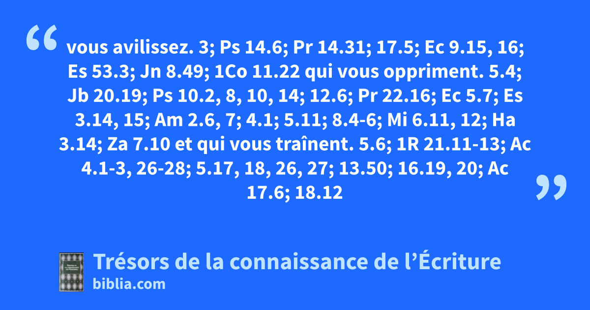 vous avilissez. 3; Ps 14.6; Pr 14.31; 17.5; Ec 9.15, 16; Es 53.3; Jn 8.49; 1Co 11.22 qui vous oppriment. 5.4; Jb 20.19; Ps 10.2, 8, 10, 14; 12.6; Pr 22.16; Ec 5.7; Es 3.14, 15; Am 2.6, 7; 4.1; 5.11; 8.4-6; Mi 6.11, 12; Ha 3.14; Za 7.10 et qui vous traînent. 5.6; 1R 21.11-13; Ac 4.1-3, 26-28; 5.17, 18, 26, 27; 13.50; 16.19, 20; Ac 17.6; 18.12