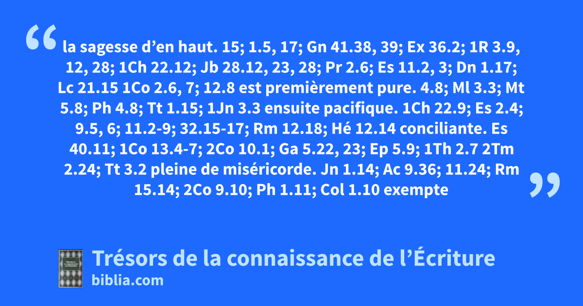 la sagesse d’en haut. 15; 1.5, 17; Gn 41.38, 39; Ex 36.2; 1R 3.9, 12, 28; 1Ch 22.12; Jb 28.12, 23, 28; Pr 2.6; Es 11.2, 3; Dn 1.17; Lc 21.15 1Co 2.6, 7; 12.8 est premièrement pure. 4.8; Ml 3.3; Mt 5.8; Ph 4.8; Tt 1.15; 1Jn 3.3 ensuite pacifique. 1Ch 22.9; Es 2.4; 9.5, 6; 11.2-9; 32.15-17; Rm 12.18; Hé 12.14 conciliante. Es 40.11; 1Co 13.4-7; 2Co 10.1; Ga 5.22, 23; Ep 5.9; 1Th 2.7 2Tm 2.24; Tt 3.2 pleine de miséricorde. Jn 1.14; Ac 9.36; 11.24; Rm 15.14; 2Co 9.10; Ph 1.11; Col 1.10 exempte de duplicité. 2.4; Ml 2.9; 1Tm 5.21 d’hypocrisie. Es 32.6; Mt 23.28; Lc 12.1, 2; Jn 1.47; Rm 12.9; 1P 1.22; 2.1 1Jn 3.18