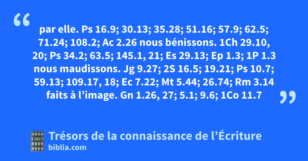 par elle. Ps 16.9; 30.13; 35.28; 51.16; 57.9; 62.5; 71.24; 108.2; Ac 2.26 nous bénissons. 1Ch 29.10, 20; Ps 34.2; 63.5; 145.1, 21; Es 29.13; Ep 1.3; 1P 1.3 nous maudissons. Jg 9.27; 2S 16.5; 19.21; Ps 10.7; 59.13; 109.17, 18; Ec 7.22; Mt 5.44; 26.74; Rm 3.14 faits à l’image. Gn 1.26, 27; 5.1; 9.6; 1Co 11.7